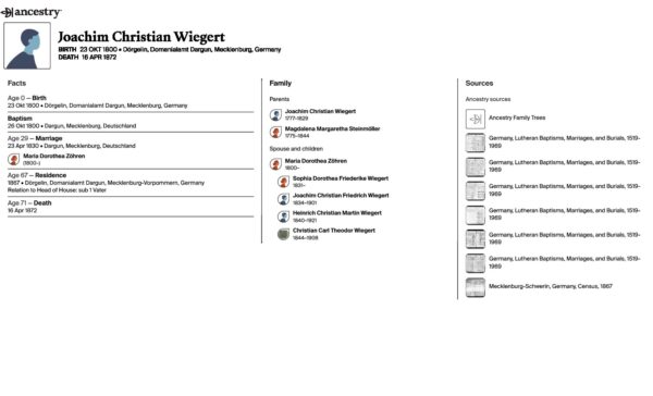 Joachim Christian Wiegert was born on October 23, 1800, and was baptized on October 26, 1800. His father, Joachim, was 23 and his mother, Magdalena, was 24. He married Maria Dorothea Zöhren on April 23, 1830. They had four children in 12 years. He died on April 16, 1872, at the age of 71.