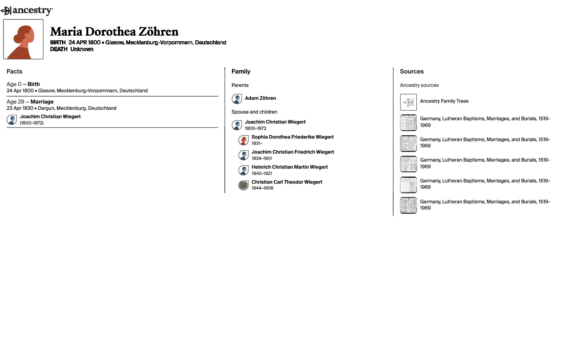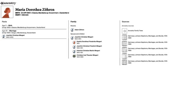 Show Bio Birth name Maria Dorothea Zöhren Place of Birth Glasow, Mecklenburg-Vorpommern, Germany Maria Dorothea Zöhren was born on April 24, 1800, the daughter of Adam Zöhren. She married Joachim Christian Wiegert on April 23, 1830. They had four children in 12 years. Go to profile page Maria D. Zöhren (1800) Husband Go to profile page Joachim C. Wiegert (1800 - 1872) Son Go to profile page Joachim C. F. Wiegert (1834 - 1901)